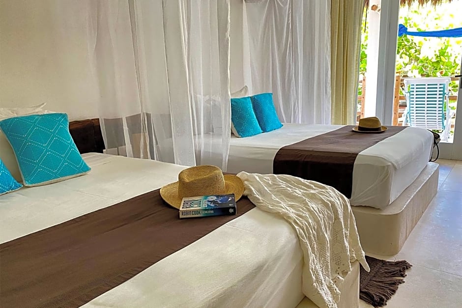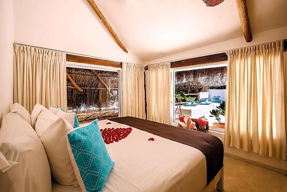 This has 3 king-size bedrooms and one small loft area with 1 queen sized bed, with a maximum capacity of 8 people ( 6 adults + 2 children), 3 bathrooms, one of which is en suite, a spacious living area, with lots of sofa space and table. The two furnished terraces are perfect for relaxing after a day at the beach or after an excursion to the various interesting sites in the area. Private hot tub on the terrace, outside sitting area with couches and beach towels 24 hours AC It is positioned on the first floor, access is up a stairway and it's located between the Yoga Palapa of our sister property The Beach Tulum and Ziggy’s Beach Club while sharing the same entrance with the restaurant.