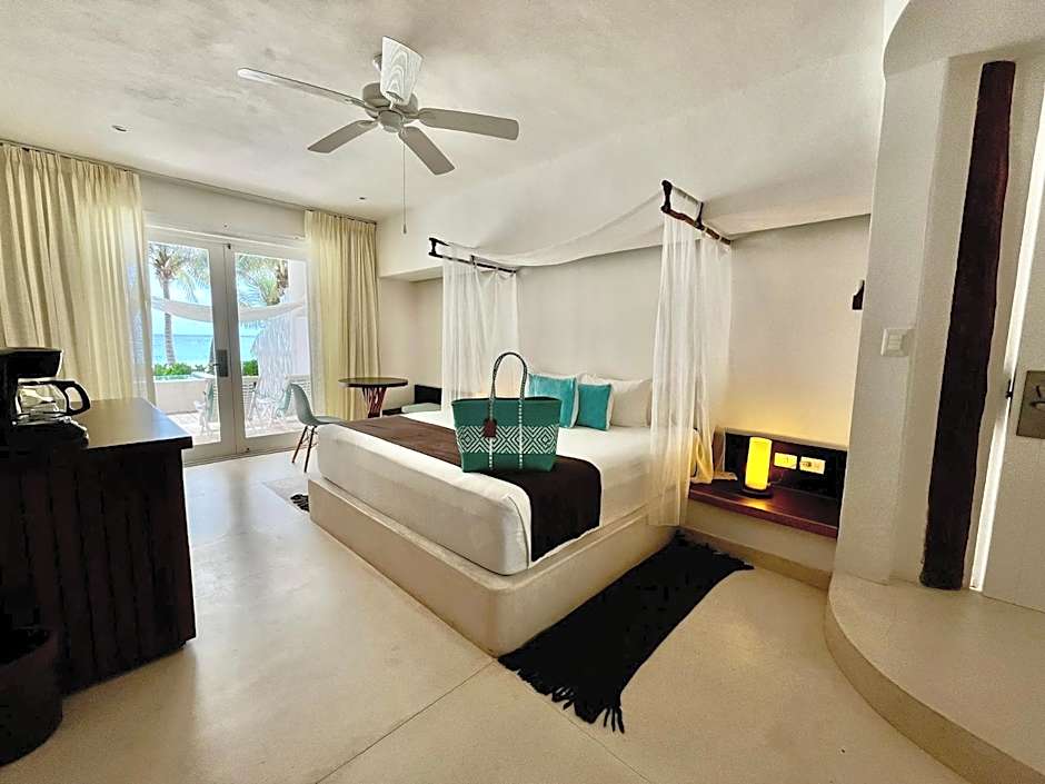 This has 3 king-size bedrooms and one small loft area with 1 queen sized bed, with a maximum capacity of 8 people ( 6 adults + 2 children), 3 bathrooms, one of which is en suite, a spacious living area, with lots of sofa space and table. The two furnished terraces are perfect for relaxing after a day at the beach or after an excursion to the various interesting sites in the area. Private hot tub on the terrace, outside sitting area with couches and beach towels 24 hours AC It is positioned on the first floor, access is up a stairway and it's located between the Yoga Palapa of our sister property The Beach Tulum and Ziggy’s Beach Club while sharing the same entrance with the restaurant.