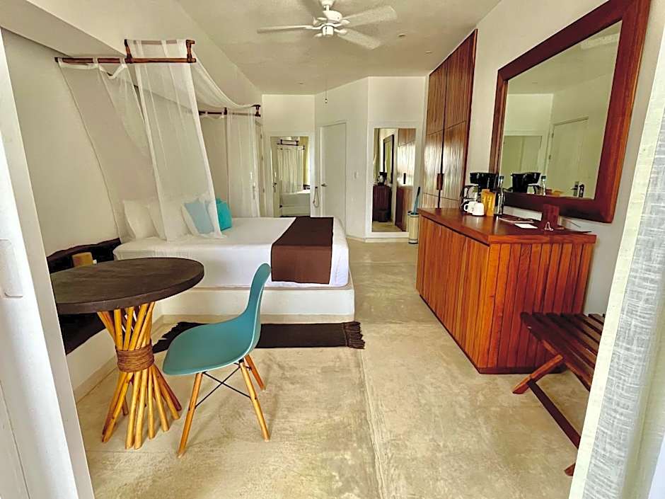 This room is surrounded by a garden area, a few steps away from Tulum’s beach, the pool and deck area. The rooms are all ground floor. It features a furnished terrace patio, a hammock on the front, a private plunge pool and sofa facing the pool.